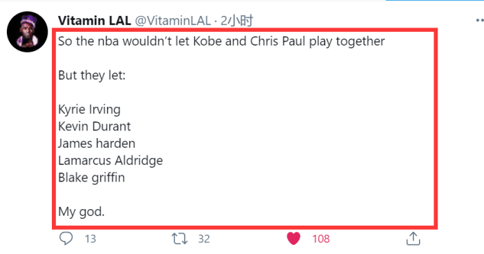 来看看美球迷都是怎么说的吧!“所以说,当时NBA不让科比和保罗联手,如今却让欧文、KD、哈登、阿德、格里芬一起打球,我的天啊!”