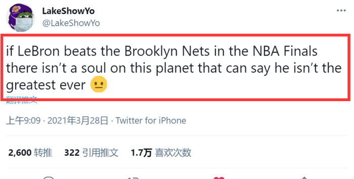 “如果勒布朗在总决赛击败篮网,那么这个星球上没有一个人可以说他不是历史最佳!”