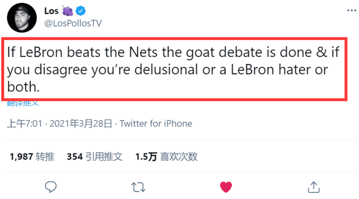“如果詹姆斯击败这支篮网,那么历史最佳的讨论就彻底可以结束了!如果你们不同意这个观点,你要么是神志不清,要么就是詹姆斯的黑粉!或者两者都是。”