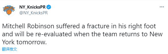 来源:直播车03-28 12:00直播车讯 北京时间3月28日,尼克斯和雄鹿比赛中出现意外伤病事件,尼克斯首发中锋米切尔-罗宾逊仅打6分钟便因伤退赛,伤情确诊为右脚骨折,尼克斯官宣这一坏消息,他将在明天返回纽约后再次接受伤势的评估。
