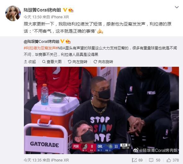 知名美女记者烤肉姐随后也发布了一条微博,她这样说:“跟大家更新一下,我刚给利拉德发了短信,感谢他为亚裔发发声,利拉德的原话:‘不用客气,这本就是正确的事情’”。
