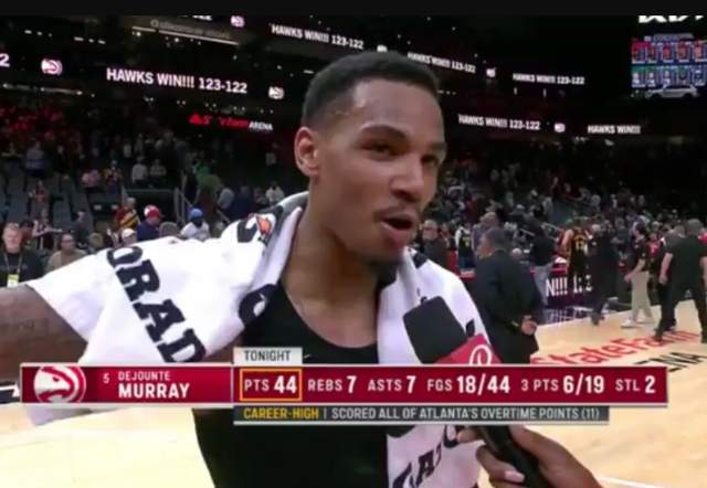 穆雷本场出手44次,44投18中,赛后在场边接受采访时记者问道关于44次出手的问题,穆雷表示:“我并不想出手这么多次,但我知道科比会为我感到骄傲。”穆雷的疯狂出手,也最终没有竹篮打水,他帮助老鹰再度击败凯尔特人,而且加时赛包揽11分的表现,也配得上他44次出手。