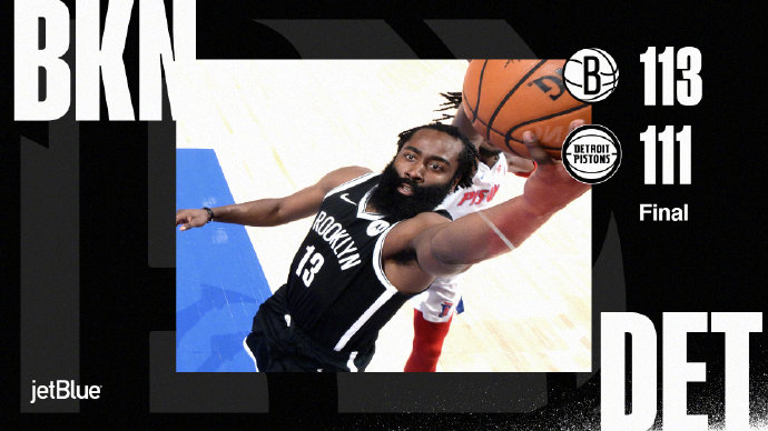 直播车3月27日讯 今日NBA常规赛,篮网客场挑战活塞。篮网目前30胜15负排名东部第3,活塞则12胜31负排名东部垫底。比赛开始,活塞率先发力取得5分领先,篮网逐渐找到进攻状态将比分反超,首节结束,篮网领先活塞7分。次节开始,斯图尔特肘击格里芬遭驱逐,哈登连续得分将分差逐步扩大,半场战罢,篮网59-50领先9分。易边再战,活塞外线手感恢复,抓住篮网失误一度将比分反超,但哈登最后时刻发力连得5分,篮网82-78领先4分结束第三节。末节初段,篮网下起三分雨,将比分优势迅速扩大至12分,活塞外线逐渐找到手感,一度将比分扳平,关键时刻,杰夫-格林命中关键三分,哈登6犯离场,随着活塞最后一攻不中,最终篮网113-111险胜活塞。