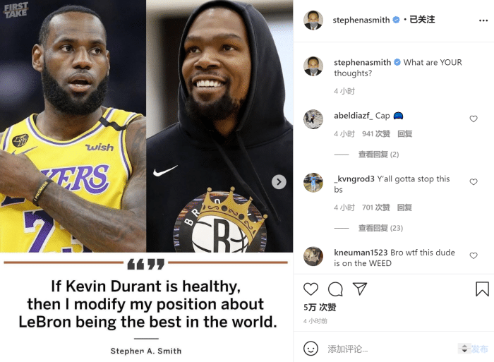 在史密斯的社交媒体,我们可以看见他发了一张图,图片上的内容就是如果杜兰特可以保持健康的话,那么詹姆斯目前世界最佳的位置或许就保不住了。这个观点一发出来就引起了球迷之间的热议,因为杜兰特和詹姆斯本身就是现在联盟的前二人,他们一直都在暗自比较,然而此前一直都是詹姆斯稳压杜兰特一头。现在史密斯突然说杜兰特可以取代詹姆斯成为世界最佳,球迷们又怎能不激动呢?