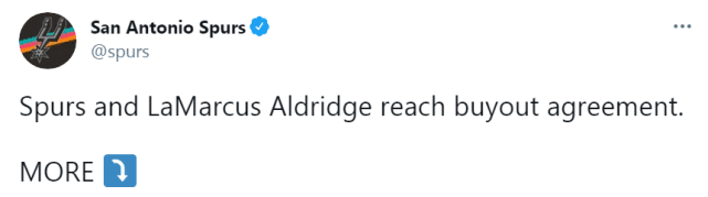 马刺官宣这一消息时,晒出了一张阿尔德里奇的照片,并配文写道:“谢谢你。”阿德生涯为马刺效力376场常规赛,场均贡献19.5分8篮板2助攻1.25次盖帽。效力马刺期间,阿德两次入选最佳阵容(2016和2018),三次入选全明星(2016,2018和2019)。