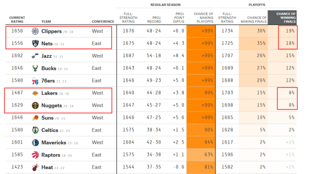 来源:直播车03-26 15:37直播车讯 北京时间3月26日,交易截止日过后,各队的实力发生了一些变化。知名数据网站FiveThirtyEight也第一时间更新了夺冠概率。引进朗多的快船,目前以19%的夺冠概率位居第一,而篮网以18%的夺冠概率排名第二。上赛季的总冠军湖人只排在第六位。