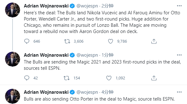 来源:直播车03-26 12:01直播车3月26日讯 重磅大交易来了,据ESPN名记报道,魔术把全明星中锋武切维奇和阿米奴交易到公牛,得到奥托·波特,小温德尔·卡特和两个首轮选秀权(2021和2023年首轮选秀权),魔术正式推倒重建,2换4正式交易全明星中锋,与此同时,魔术还交易富尼耶,戈登以及特伦斯-罗斯等主力也被摆上货架。
