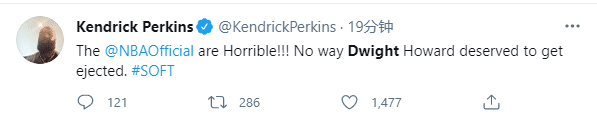 对于霍华德遭驱逐,名嘴帕金斯发推写道:裁判吹罚太可怕了!!!霍华德绝不应该被驱逐出场。#太软了