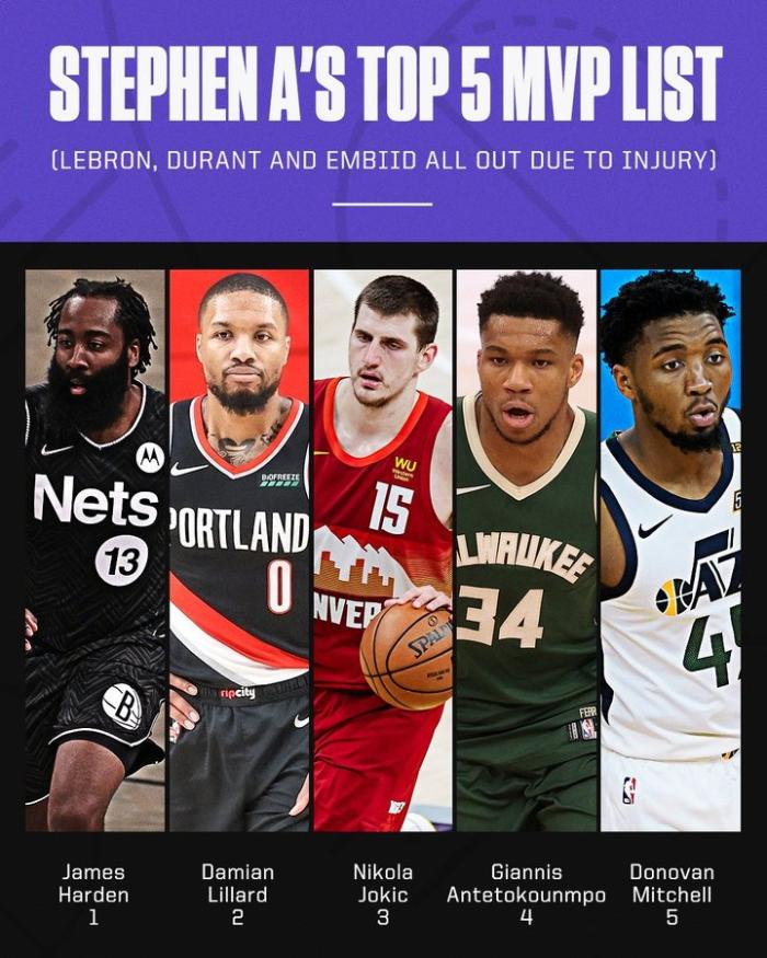 能在有点小伤就调整总比积劳成疾造成大伤要好,本赛季赛程密集,有太多超巨伤停了!包括本队的杜兰特,湖人双核,东部第一76人的恩比德!嘴史蒂芬-A-史密斯今日更新个人社交媒体,晒出自己心中排名前五的MVP人选:哈登排名第1,2-5位分别是利拉德、约基奇、字母哥、米切尔。