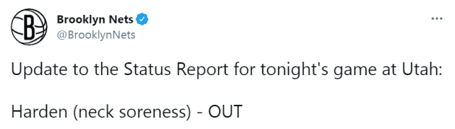 上一场对阵开拓者,哈登赛后就表示自己接近缺席,但最终还是带伤上场。这一场背靠背打爵士,篮网也终于给哈登放了一天假。打工人哈登难得休息一回。这是自哈登加盟篮网以来缺席的第二场比赛,此前他曾缺席2月1日对奇才的比赛。