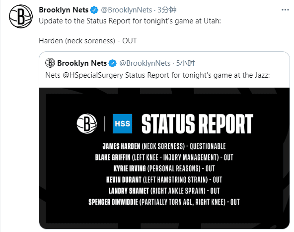 来源:直播车03-25 16:11直播车3月25日讯 篮网客场背靠背对阵爵士,杜兰特和欧文都没有随队出征,格里芬因负荷管理缺席比赛,哈登(颈部酸痛)也因伤缺阵,篮网官方已经宣布这样的伤病报告;哈登终于再次轮休,篮网生涯第二次缺席比赛,篮网三巨头全都无缘对阵联盟第一。