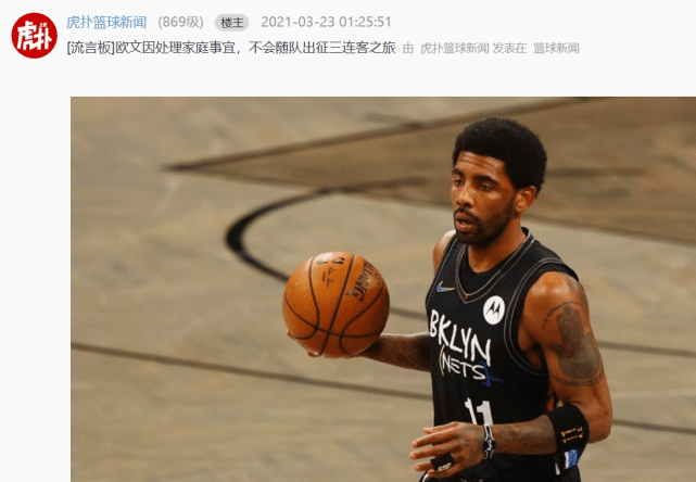 欧文由于处理家庭事宜不会随队出征接下来的三连客之旅。具体事宜并没有公开,不过这符合欧文的作风,本赛季他已经不是第一次因为个人原因不是因为伤病而缺席比赛了,截止到现在他缺席了12场比赛,在哈登到来前,欧文因为“社会问题”而离队!