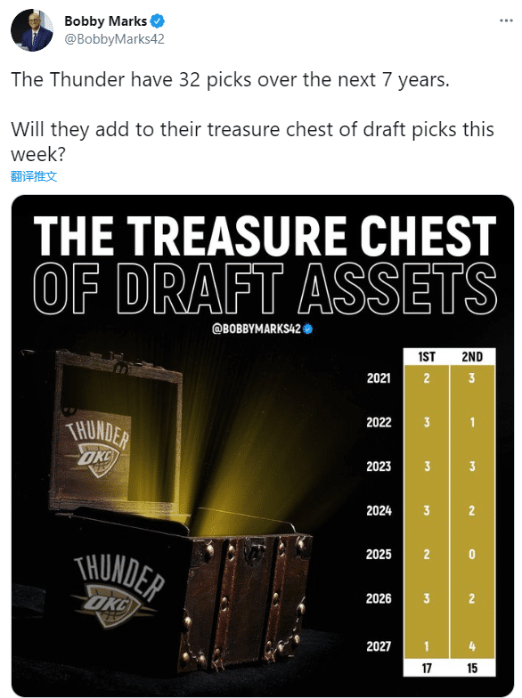 来源:直播车03-23 10:54直播车3月23日讯 ,距离NBA交易截止日已经只剩下3天时间,各队也都希望在最后时刻进行补强或者交易。而对于本赛季无欲无求的雷霆来说,他们甚至可能会继续出售球员囤积选秀权。NBA薪资专家Bobby Marks晒出了雷霆在未来7年的选秀权,竟然达到了疯狂的32个!NBA头号“屯粮”大队,实至名归。