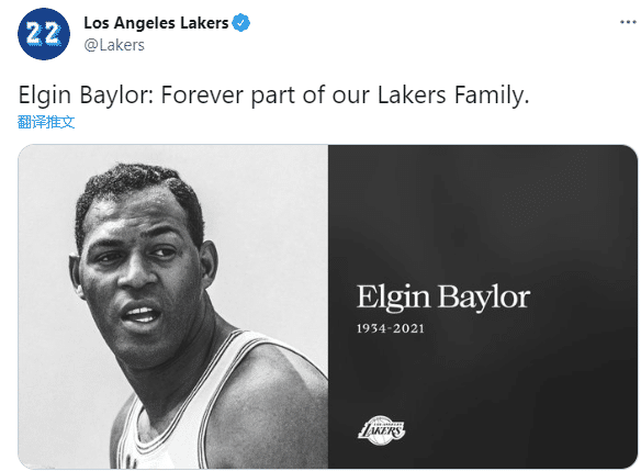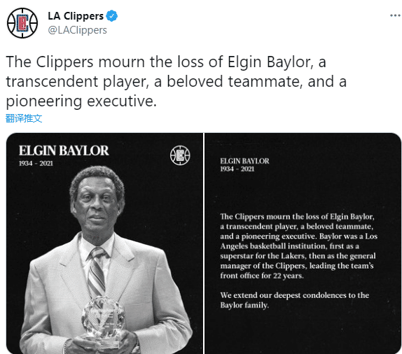 快船官方发表声明:快船为埃尔金-贝勒的逝世表示哀悼,他是一位超凡的球员,有爱心的队友和一位开创性的高管。