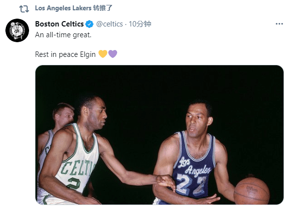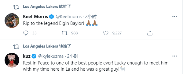 湖人官方也转发多条向贝勒致敬的动态,湖人球员大莫里斯发推;安息吧,传奇埃尔金-贝勒;库兹马则是写道:安息吧,史上最好的人之一!我有幸在湖人认识了他,他真是一个伟大的球员(山羊表情)