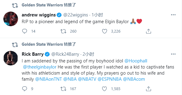 勇士官方转发维金斯和里克-巴里的动态,维金斯发推:安息吧埃尔金-贝勒,联盟的先驱和传奇人物;巴里发推:我为儿时偶像的去世而难过,为他的妻子和家人祈祷。