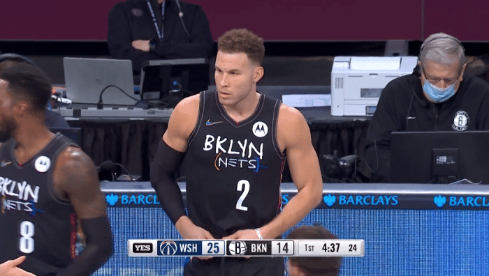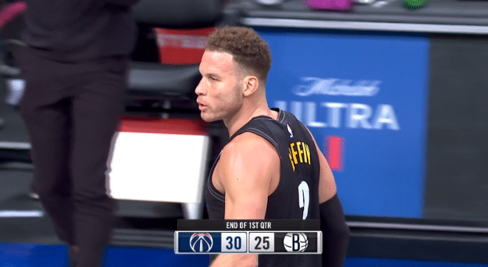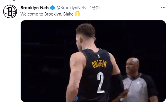赛前,格里芬不仅加练弧顶和底角三分,而且热身时单手暴扣;篮网开局被奇才打出20-6攻势,随后篮网疯狂反扑,打到首节4分37秒,格里芬身披2号替补上场,现场响起掌声,篮网官方发推写道:欢迎来到布鲁克林,布雷克。