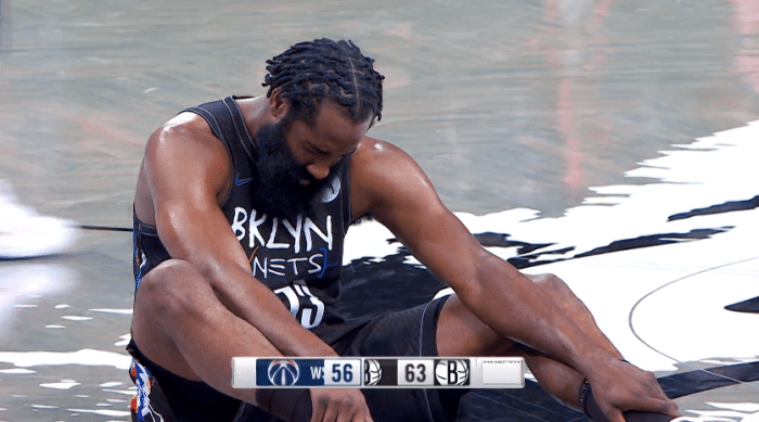 上半场快结束时,哈登和奇才球员马修斯争抢球权,结果哈登被马修斯撞到头部,当时哈登表情痛苦,捂着嘴巴坐在地板上,放弃最后一攻;半场结束后,篮网队医过来检查哈登的伤势,欧文等队友也围过来,哈登左右以及上下摇摆自己的脖子,表情显得有些晕,然后慢慢地走回更衣室。