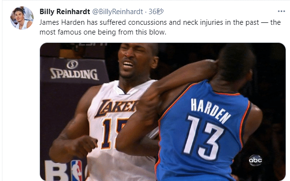 篮网记者晒出哈登曾经惨遭阿泰斯特恶犯肘击的恐怖一幕,当时哈登脖子受伤而且脑震荡,相信很多球迷都对哈登惨遭肘击的一幕仍旧是历历在目;所幸这一次哈登没事,被撞到脑袋只是虚惊一场。