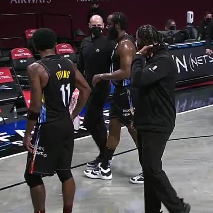 返回更衣室时,欧文看着哈登十分担忧,不过哈登脖子伤势应该无碍,下半场又早早来到球场上热身,并且继续首发出战;整个上半场,篮网首节开局不顺,然后哈登和欧文带队疯狂反扑,第二节38-26反超比分扭转局面,所幸哈登伤势无碍。
