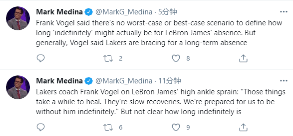 湖人和太阳大战赛前,湖人主教练沃格尔表示:詹姆斯的伤势需要一段时间才能治愈,康复速度很缓慢,湖人队已经做好了詹姆斯无限期休战的准备;与此同时,沃帅表示这伤病太让人厌烦,詹姆斯的意外受伤可能会影响湖人的引援操作。