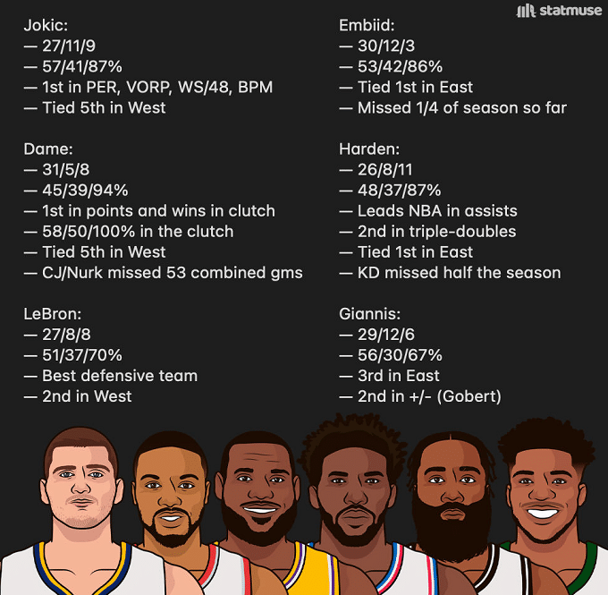 来源:直播车03-20 14:46直播车3月20日讯 今年NBA常规赛的MVP竞争是非常激烈的,在官方公布的新一期MVP榜单中,约基奇霸占榜首,利拉德和字母哥分居后面,詹姆斯、恩比德和哈登排名第4-6名。看起来每名球员在本赛季的表现都很出色,而现在比赛结束之后也会有不少的球员、教练和媒体人热议全明星的归属,现在看起来三人的可能性最大,詹姆斯、哈登和约基奇。
