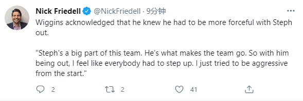 赛后谈到这一场比赛,维金斯躺在酒店里表示:库里是这支球队的重要一员,他是球队前进的动力,因此,当他缺席的时候,我觉得每个人都需要加倍努力,我只是从比赛一开始就尝试打出侵略性。