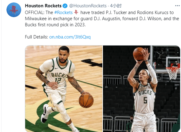 来源:直播车03-20 14:17直播车3月20日讯 火箭和雄鹿两队正式官宣大交易完成,火箭把塔克、库鲁茨和首轮选秀权(2022年)交易到雄鹿,得到DJ-奥古斯汀、DJ-威尔逊、2023年首轮选秀权和次轮换首轮的互换权;35岁塔克正式加盟雄鹿,如愿离开火箭并且加盟冲冠豪强。
