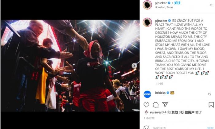 来源:直播车03-19 15:52直播车3月19日讯 ,之前完成交易的PJ塔克正式前往密尔沃基,昨日他在个人社媒上发长文感慨火箭时光,感谢老东家给自己的一切!