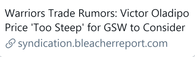 来源:直播车03-19 15:19直播车3月19日讯 勇士曾经有意得到火箭的奥拉迪波,但火箭的要价让他们放弃了继续深入谈判。北京时间3月19日,勇士前方记者Connor Letourneau证实,勇士确实向火箭询价奥拉迪波,但也只是停留在询价的阶段。火箭的要求太高了,他们想要2021年森林狼的首轮签或者怀斯曼,这一要价导致询价的中止。