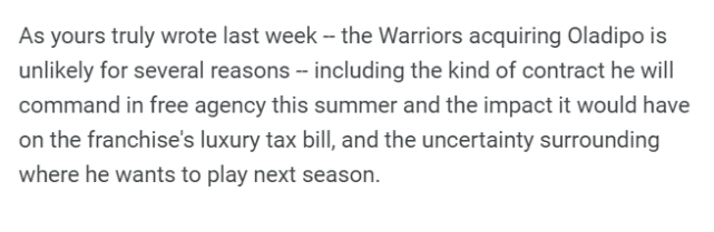 其一,勇士本身的奢侈税。目前,勇士的奢侈税账单已经高达1.37亿美元,以奥拉迪波对自身未来合同的预估,可能会给勇士的奢侈税带来更大的涨幅。如今的勇士,实力已经不是几年前,老板未必愿意在不能确保战绩的情况下进行这么大的投入。