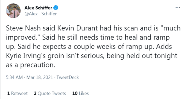 前些日子,纳什就透露杜兰特需要在这一周接受腿筋伤势的复查,现在,杜兰特已经完成复查。纳什表示,和之前相比,杜兰特已经好多了(much improved),预计仍需要几周时间来达成最终复出的目的。