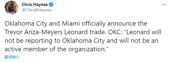 雷霆官方也发表声明:M-伦纳德不会到球队报到,也不会代表球队出战!