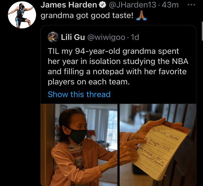 94岁球迷研究NBA!列出各队最喜欢的球员,哈登:奶奶品味不错
