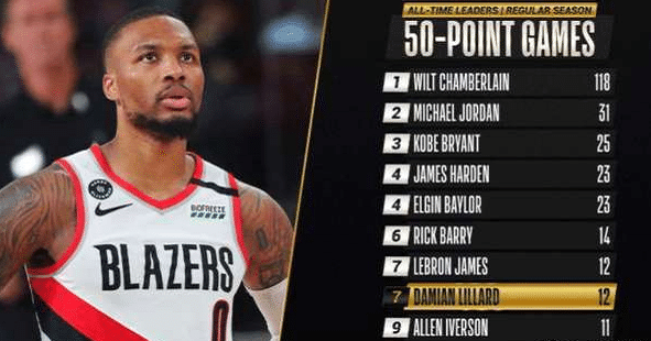 这是利拉德第12次单场比赛至少砍下50分,这让他在NBA历史得分50+场次排行榜上追平了詹姆斯,并列第7。