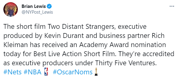 来源:直播车03-16 16:31直播车讯 恭喜!杜兰特又有新成就,据篮网记者报道,杜兰特担任制片人制作的短片《Two Distant Strangers》已经获得奥斯卡金像奖最佳真人短片(提名);当初科比获得奥斯卡小金人时,杜兰特曾表示篮球运动员获得奥斯卡,这代表了很多东西。