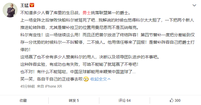 比赛结束之后,知名篮球人王猛也在社交媒体上盛赞勇士和他们的主帅科尔,王猛称上一场勇士惨败给快船之后变阵的科尔都快被骂死了,但是科尔有定性,今天的坚持就有收获,即便是到了关键时刻也不暂停不换人,最终获得了不错的结果。