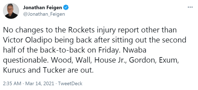 来源:直播车03-14 17:59直播车讯 北京时间3月14日,火箭公布了球队的最新伤情,和一天前相比,除了奥拉迪波复出之外,其余情况相同。戈登(右腹股沟)、豪斯(右膝)、沃尔(左膝)、伍德(右踝)都无法出场,库鲁茨和埃克萨姆也都有伤在身,塔克继续等待交易,努瓦巴(右腕)出战成疑。
