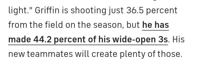 CBS体育列出了一项数据,格里芬本赛季的空位三分命中率高达44.2%,远高于他的赛季投篮命中率和三分命中率,联手三巨头,他能发挥这项优势。
