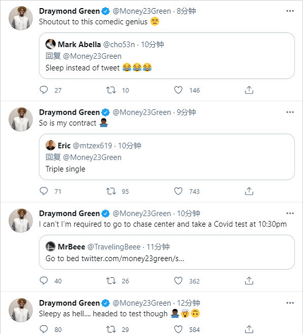 同时追梦格林还在社交媒体上疯狂更新,他和球迷们互怼,这是追梦格林发动态,称自己感到非常困,但是10:30要去球馆核酸检测,没法睡觉,所以在社交媒体上频繁更新,一时间有球迷们关注并且给他留言。