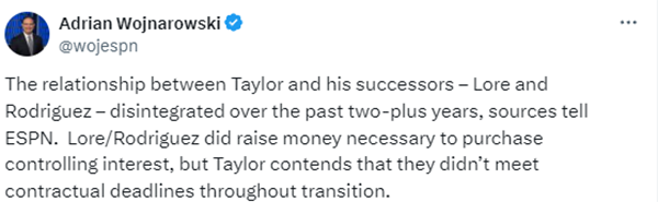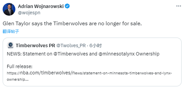 Woj则是报道称,在购买球队的交易过程中,森林狼老板格伦-泰勒与继任者罗德里格斯和马克-洛尔的关系破裂。罗德里格斯和马克-洛尔确实筹集到了足以购买球队多数股权的钱,但是格伦-泰勒表示,在整个购买过程中,他们都没有遵照合同期限。