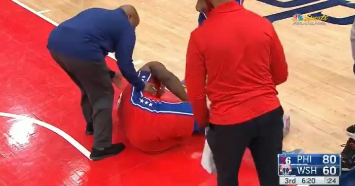 费城球星恩比德在一次进攻中对着马修斯完成隔扣后痛苦倒地,并捂着自己的左膝。慢镜头显示恩比德在下落过程中左膝抻到了地板,膝盖反关节伸展太吓人;随后恩比德忍痛站起来,一瘸一拐走回了更衣室;恩比德左膝受伤离场,这一幕让球迷太揪心。