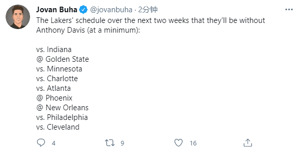 浓眉小腿伤势还没痊愈,至少再伤停两周,湖人队医将在两周后再次对浓眉进行复查,目前还没有浓眉复出的具体时间表;湖人接下来两周要打8场比赛,浓眉因伤无法缺阵,这段时间又需要詹姆斯继续一肩挑。