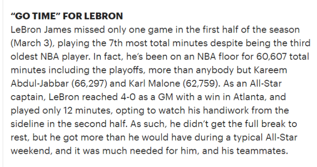 湖人上半程24胜13负,詹姆斯只缺席了一场比赛。他是现役年龄第三大的球员,而他本赛季的总出场时间高居联盟第七位。湖人官网公布数据,詹姆斯的生涯总出场时间(包含季后赛)已经达到60607分钟,在联盟历史上也能排到第三,仅次于贾巴尔(66297分钟)和卡尔-马龙(62759分钟)。