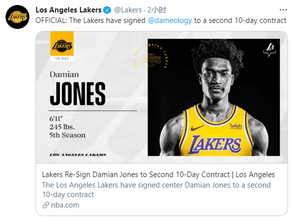 此前洛杉矶湖人正式官宣,和达米安-琼斯再次签约一份十天短合同,此前琼斯已经为湖人出战三场比赛,场均上场10.3分钟能够拿到4分1.7篮板和1.3盖帽;恭喜25岁琼斯再次拿到合同,又获得十天的证明自己的机会。