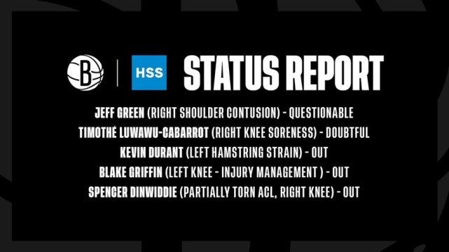 篮网官方发布了明日比赛的伤病报告,凯文-杜兰特(左腿筋拉伤)、布雷克-格里芬(左膝伤病管理)将缺席比赛;蒂莫泰-卢瓦乌-卡巴罗(右膝酸痛)不太可能出战;杰夫-格林(右肩挫伤)出战成疑。伤病现在是阻碍篮网夺冠的第一大问题,让人有些担忧!