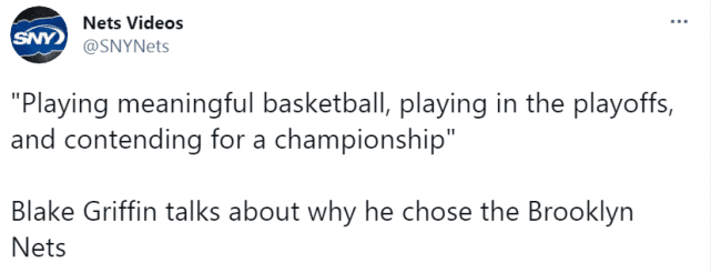 在采访中,格里芬谈到了自己选择篮网的原因。“打有意义的篮球,能够打季后赛,为总冠军而战,”格里芬说道。