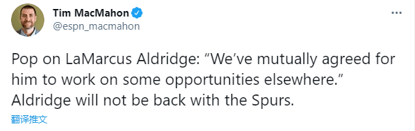马刺主帅波波维奇谈到这件事,直言:阿尔德里奇将不会继续与球队共同前进了,而球队也正在为他寻找其他的机会,他将不会再为马刺出场了;球队与阿尔德里奇之间达成了一致,同意为他寻找为别队打球的机会。