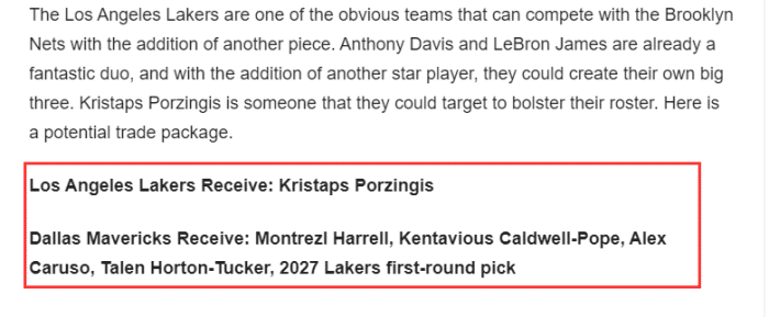于是美国知名体育媒体《FW》建议湖人零钱换整,想当年换浓眉哥那样再梭哈一把,打包送出哈雷尔、波普、卡鲁索、塔克和2027年首轮选秀权,从独行侠换来波尔津吉斯。