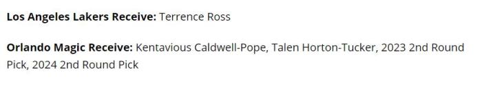 于是美国知名体育媒体《nbaanalysis》专栏记者Greg Patuto撰文分析,建议湖人打包送走波普、小塔克、2023年次轮选秀权和2024 年次轮选秀权作为交易筹码,从魔术换来特伦斯-罗斯。